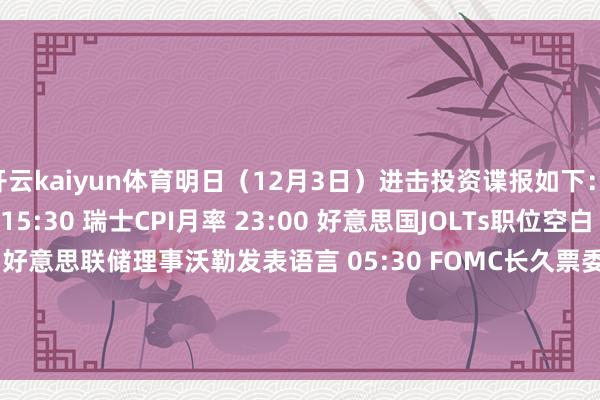 南边财经12月2日电,明日(12月3日)进击投资谍报如下: 【经济数据】 15:30 瑞士CPI月率 23:00 好意思国JOLTs职位空白 【要紧事件】 04:15 好意思联储理事沃勒发表语言 05:30 FOMC长久票委、纽约联储主席威廉姆斯干涉皇后区商会举办的一次对话 【新股申购】 无开云kaiyun体育 【新债申购】 无