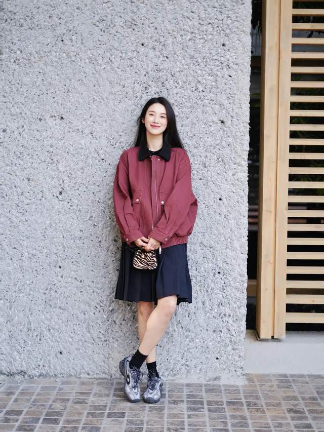 Tips ③:紫红色夹克+藏蓝色压褶半身裙