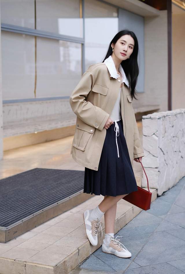 一件卡其色的短外衣,内搭一件白色的打底衫和一条藏蓝色的压褶半身裙,脚上一稔一对德训鞋,勤俭而不只调,短暂拿持氛围感。