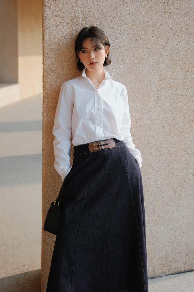 诚然一稔一条裙子已弥漫体恤有女东说念主味,可气质从不啻于此。白色的衬衫搭配蓝色的牛仔半身裙,干净且略显清淡,如果我们再添上一对缜密的珍珠耳钉,气质坐窝祥和大方,低调又前锋。