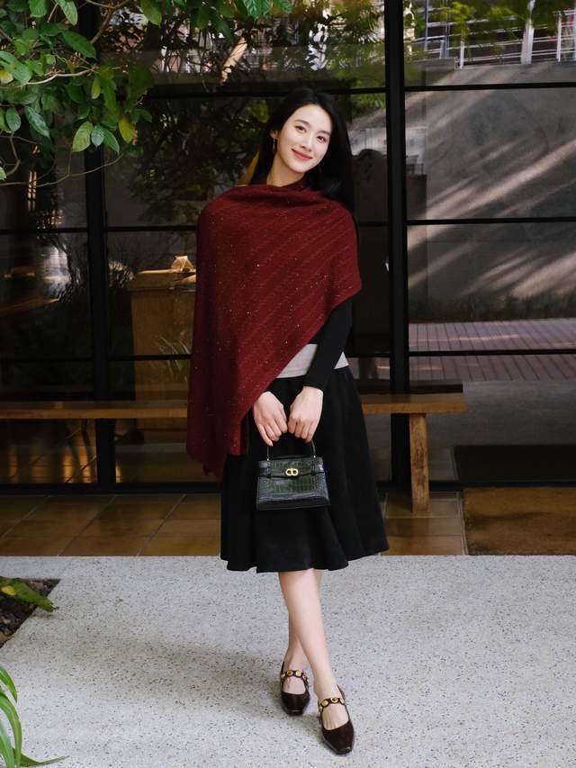 肩膀上再披上一条红色的领巾,和脚上的棕红色浅口单鞋酿成色调呼应。经典的配色文静又耐看。少量红绸又暗暗注入活力,让穿衣打扮勤俭却不只调。