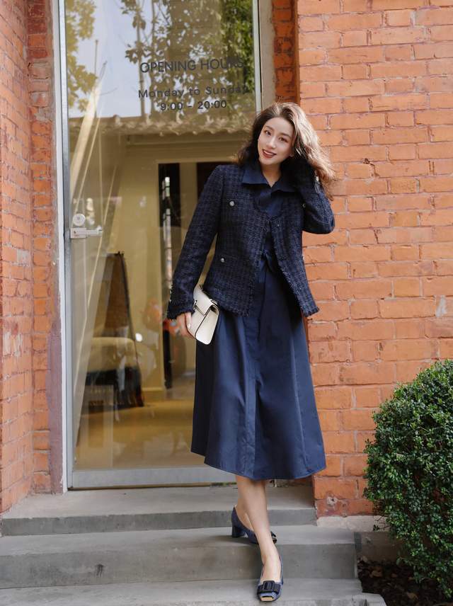 思让我方的打扮低调又显高等,我们不错给与顺色的搭配形态,还绝营业出错。独处藏蓝色小香风外衣配同色系衬衫,以高腰收腰伞状半身裙,脚踩一对雾霾蓝的浅口粗跟单鞋,这种同色系体恤相融,确乎能使得穿搭者更大气。