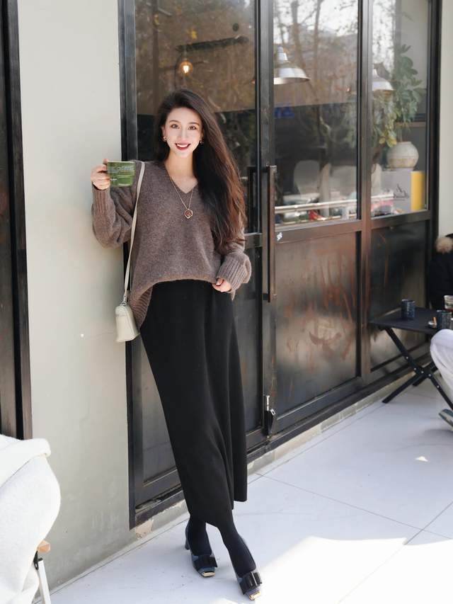 给与一件燕麦色的 V 领诚挚毛衣,搭配上一条玄色的直筒半身裙,浅深分明,对比干净,惟有将诚挚毛衣衣角轻轻地塞进裙子少量,赫然腰线坐窝呈现出来。