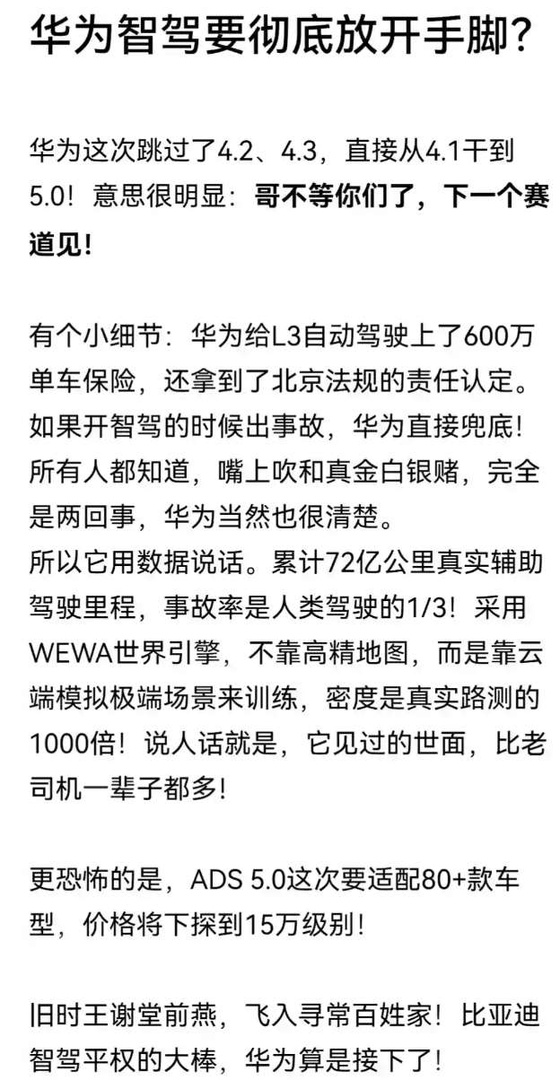 当通盘车企还在 4.2、4.3 级智驾上挤牙膏的时候,华为平直一脚油门跳过中间版块,从 ADS 4.1 干到了 ADS 5.0,用一句 “哥不等你们了,下一个赛谈见”,平直给通盘这个词智驾行业按下了加快键。更狠的是,此次华为不仅在时间上透顶放开四肢开云kaiyun,更平直把价钱下探到 15 万级别,适配 80 + 款车型,让高阶智驾真确飞入寻常庶民家,比亚迪手里智驾平权的大棒,华为算是稳稳接下了。