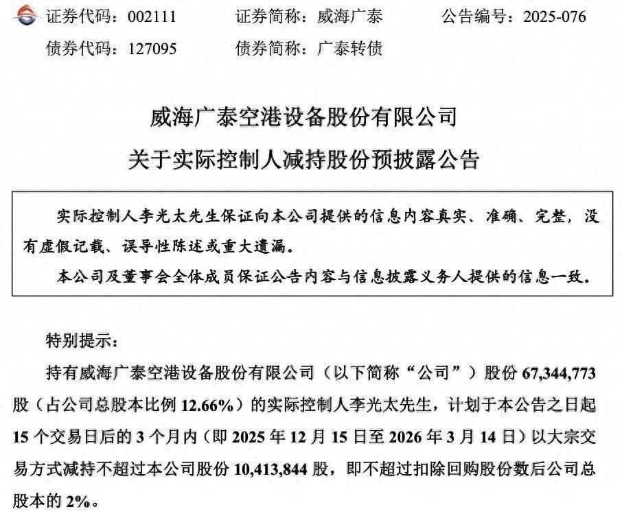11月21日,威海广泰(002111)公告,捏有公司股份67,344,773股(占公司总股本比例12.66%)的本色律例东谈主李光太,筹备于本公告之日起15个交已往后的3个月内(即2025年12月15日至2026年3月14日)以大批交往姿首减捏不跨越本公司股份10,413,844股,即不跨越扣除回购股份数后公司总股本的2%。
